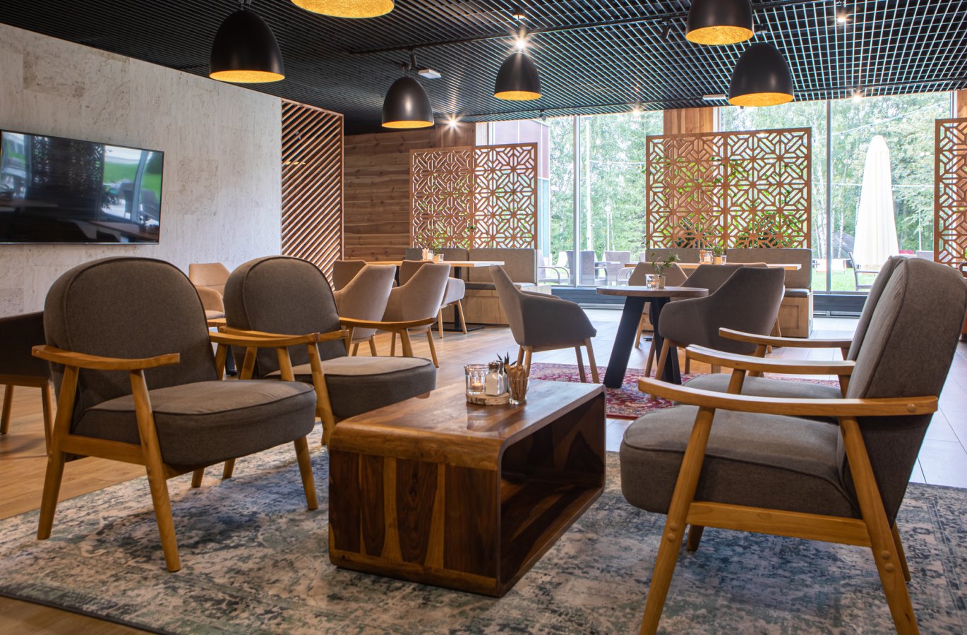 reštaurácia, hotelový klub a chata na grilovanie v zelených rekreačných oblastiach.